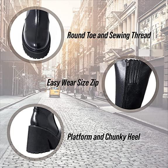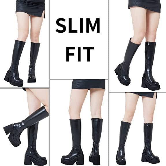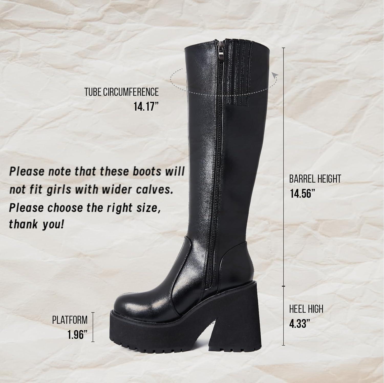 AMINUGAL Knee High Women’s Black Wide Calf Wedge Chunky Gothic Motorcycle Combat Boots(Black)