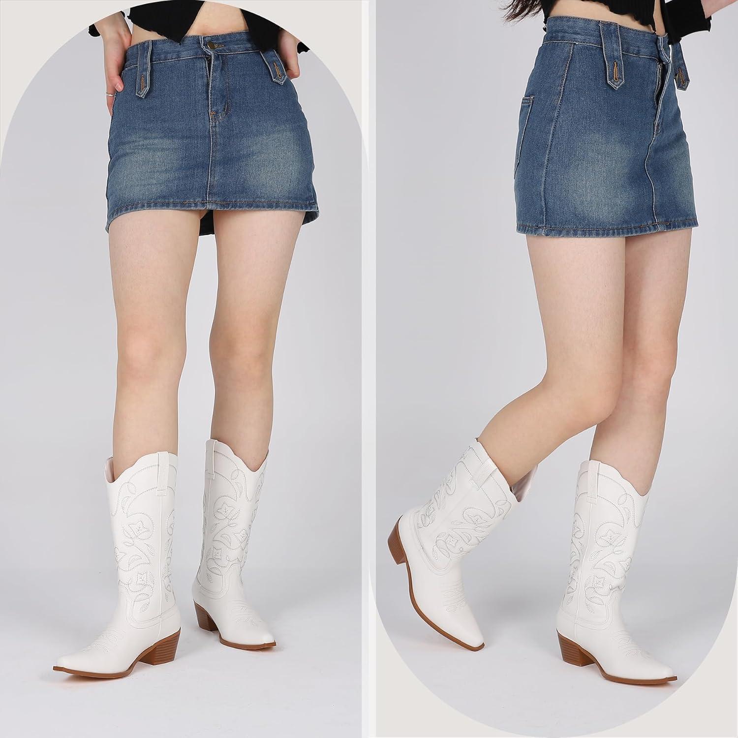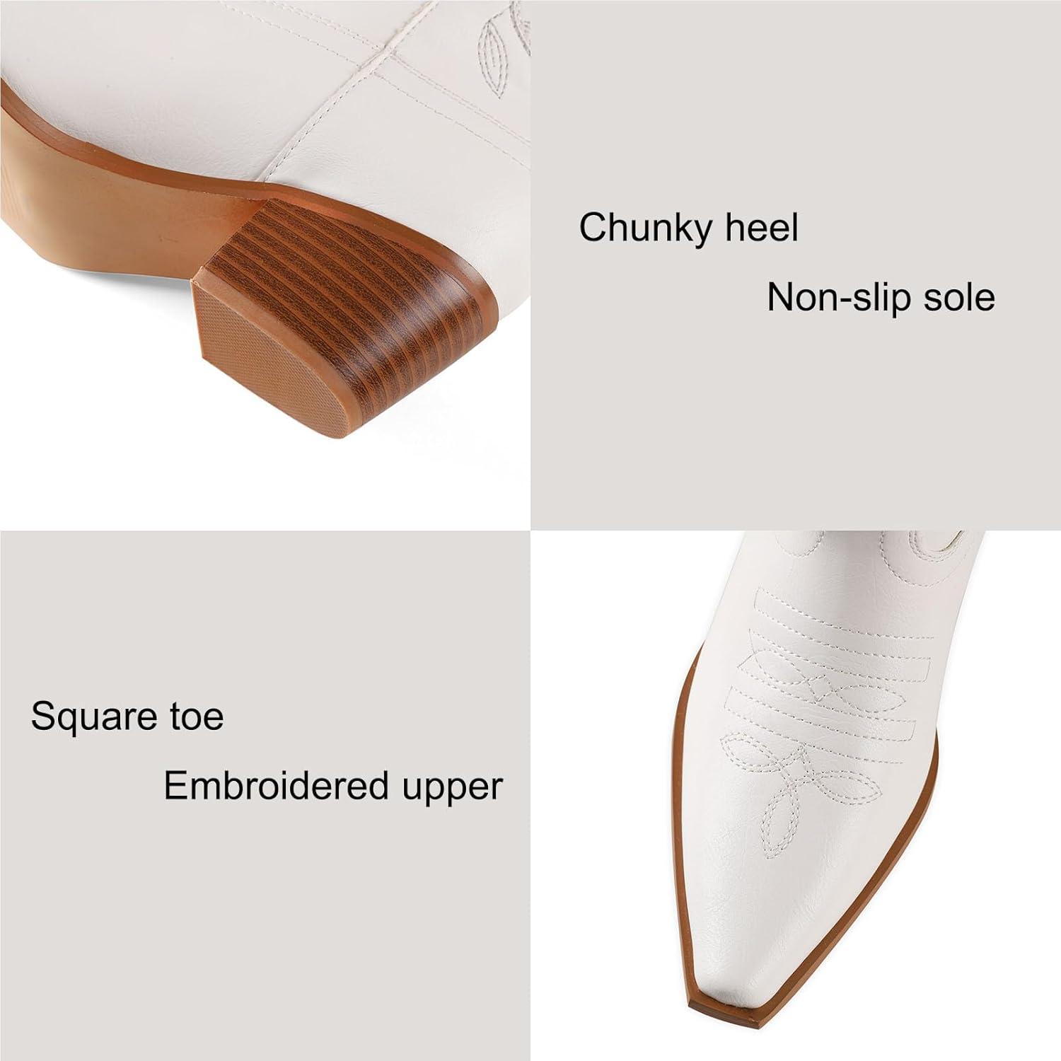 AMINUGAL Cowboy Boots for Women Mid Calf Cowgirl Boots Pointed Toe Chunky Heel Embroidered Western Boots Women Pull On Fashion Retro Classic Ankle Boots(I-white)