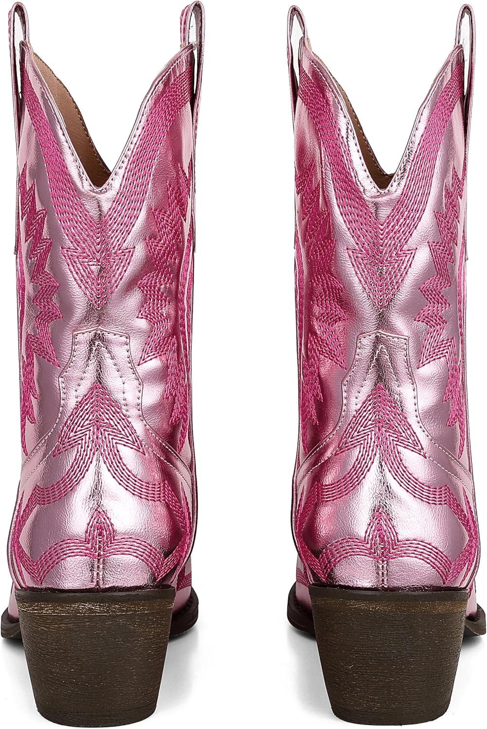 AMINUGAL Cowgirl Boots Chunky Heel Cowboy Boots for Women Pointed Toe Pull On Western Boots Women’s Ankle Boots Country Concert Fashion Retro Metallic Booties(A-pink)