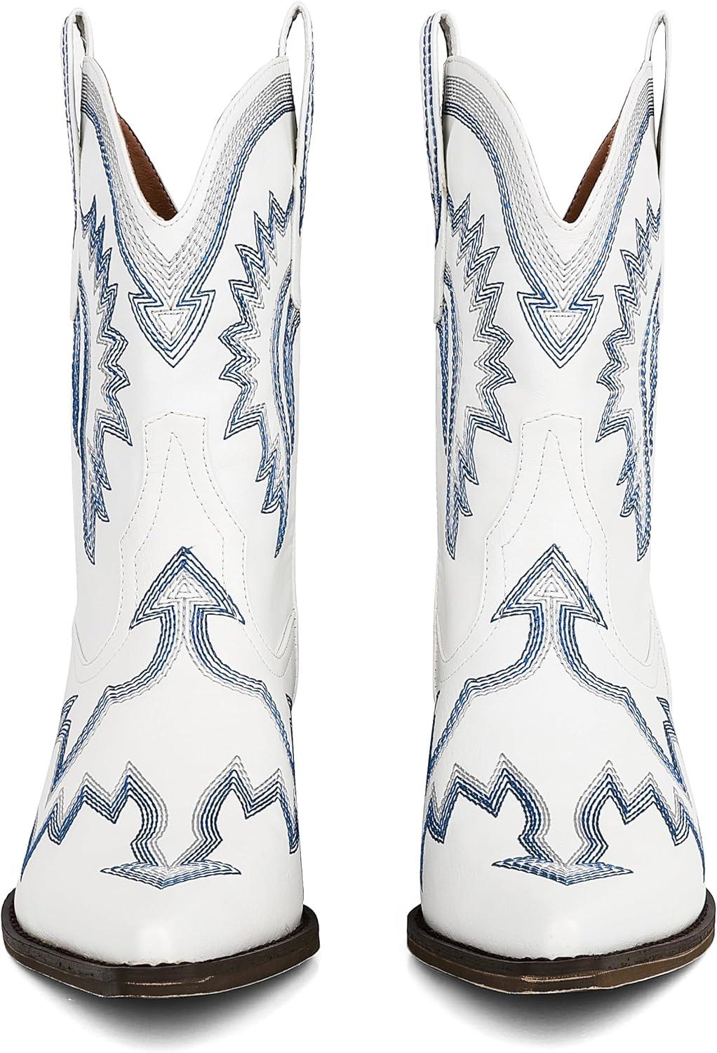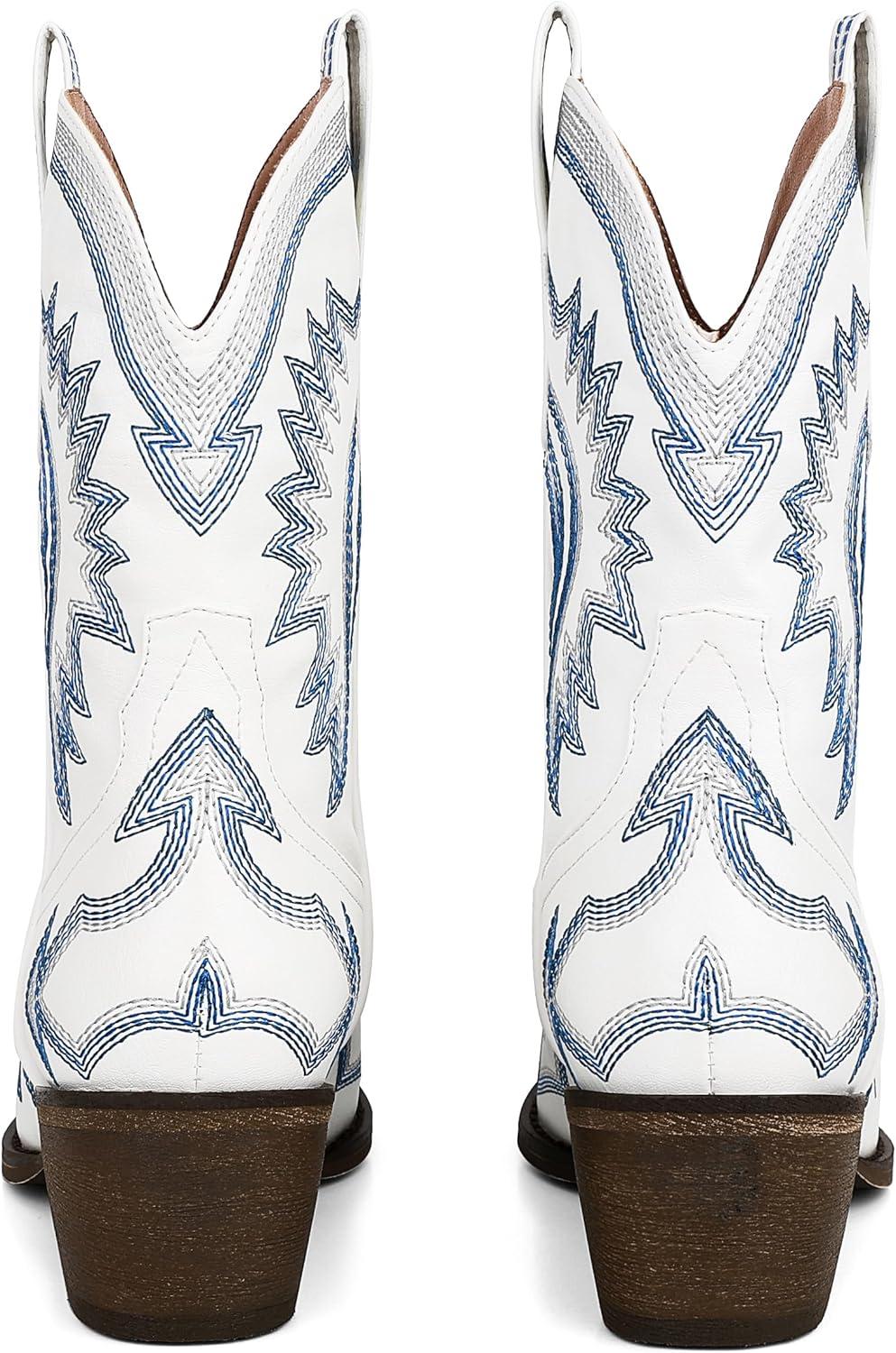 AMINUGAL Cowgirl Boots Chunky Heel Cowboy Boots for Women Pointed Toe Pull On Western Boots Women’s Ankle Boots Country Concert Fashion Retro Metallic Booties(A-white)