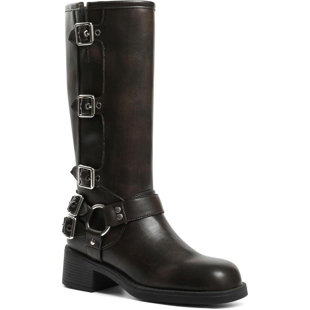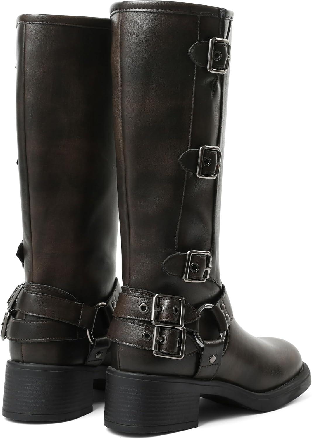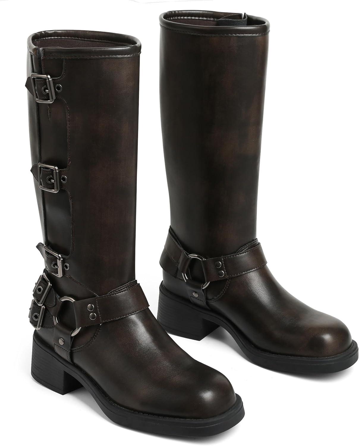 imageAMINUGAL Knee High Boots Women Square Toe Pull On Wide Calf Riding Fashion Buckles Chunky Metallic Casual Vintage Buckle RivetCredbrown