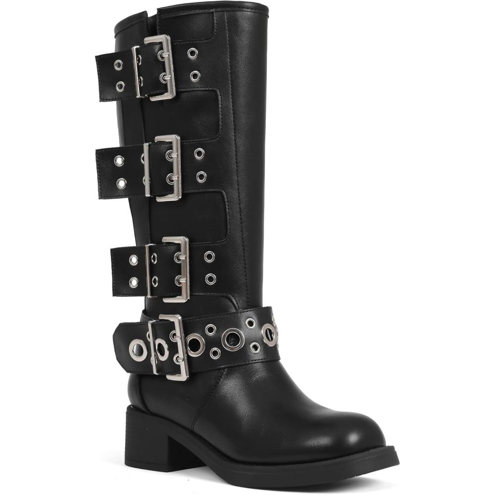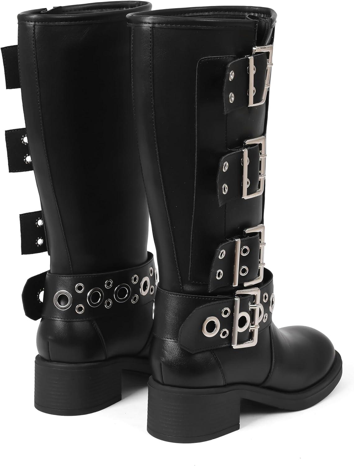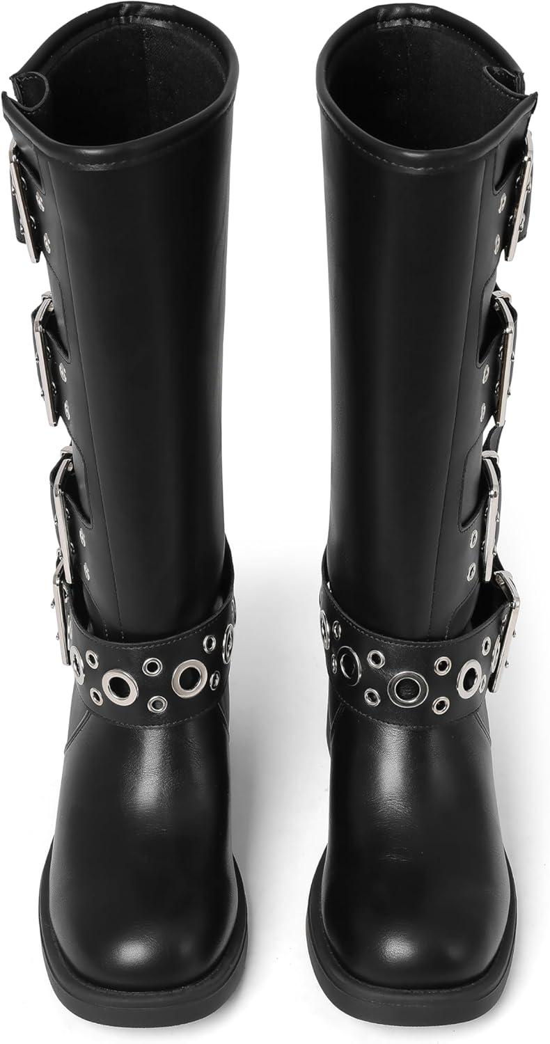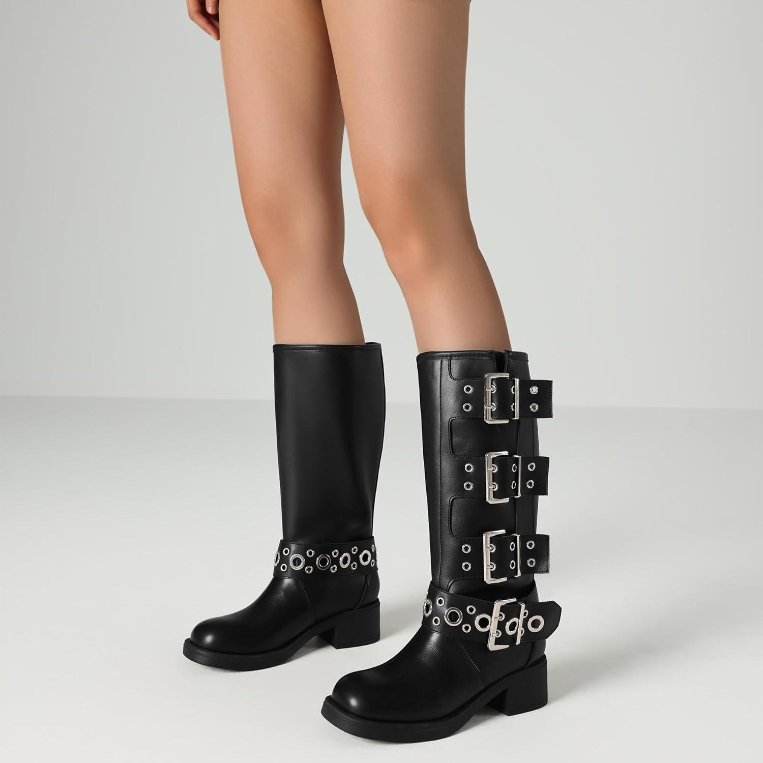 AMINUGAL Knee High Boots Women Square Toe Pull On Wide Calf Riding Fashion Buckles Chunky Metallic Casual Vintage Buckle Rivet(S-black)