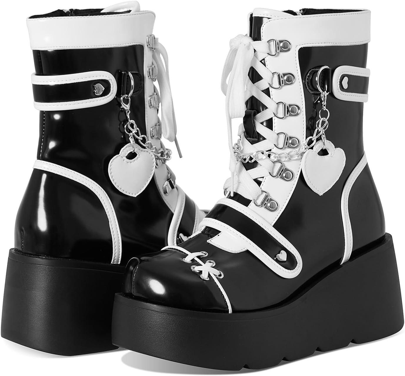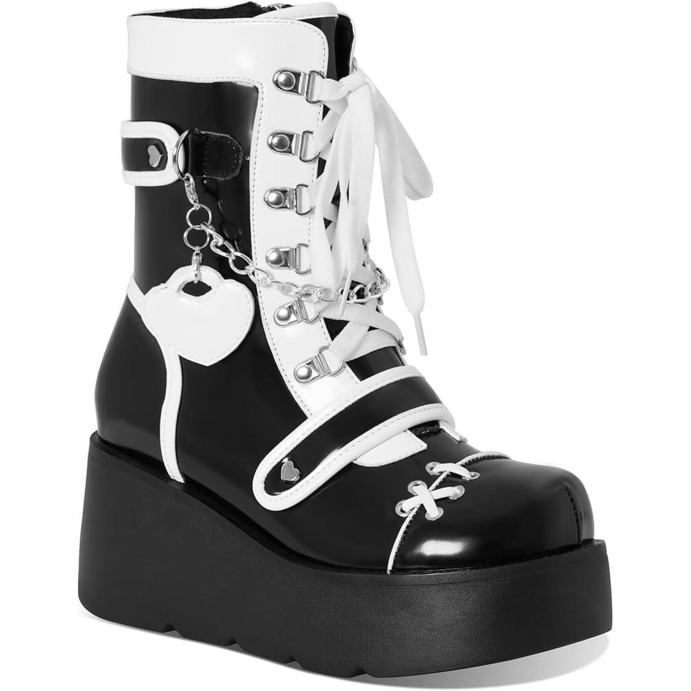 Score big on AMINUGAL Platform Ankle Boots for Women Wedge High Heel Goth Round Toe Combat Booties Lace Up Outdoor Boot Dress Shoes with Chain for Date Vacation School Wear(Black and White) and accessories during our BOGO sale. Buy one, get one 50% off!