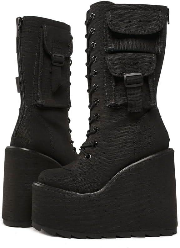 AMINUGAL Platform Boots for Women Wide Calf Punk Goth Black Boots Lace Up Wedge Boots for Women Round Toe Women’s Mid-Calf Boots Moto Gothic Motorcycle Combat Boots Womens(Black)