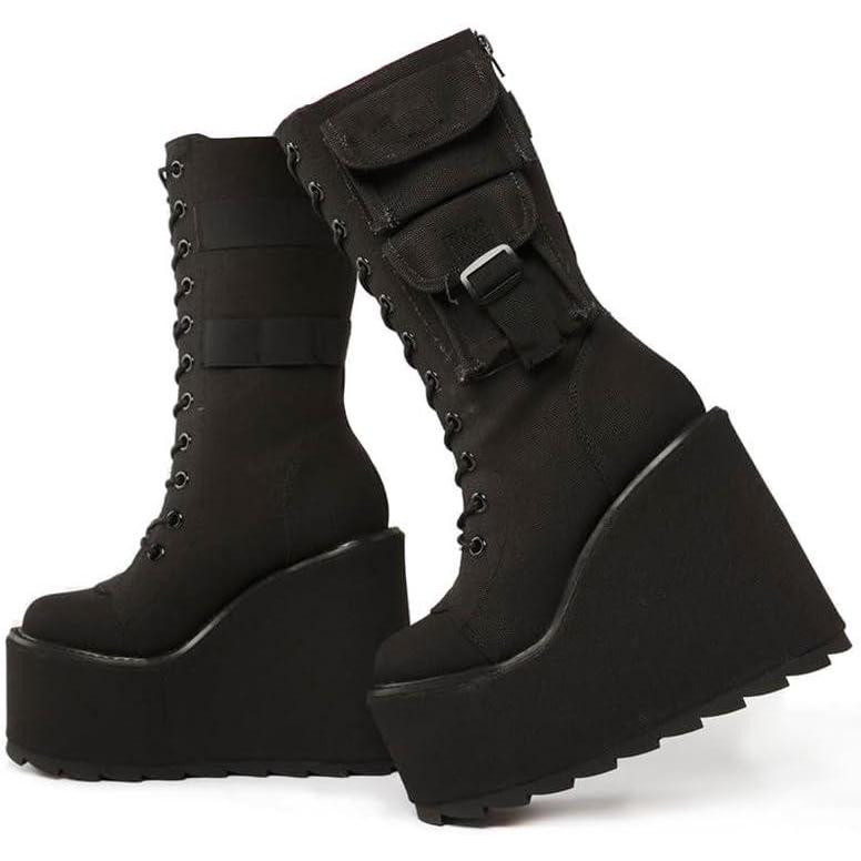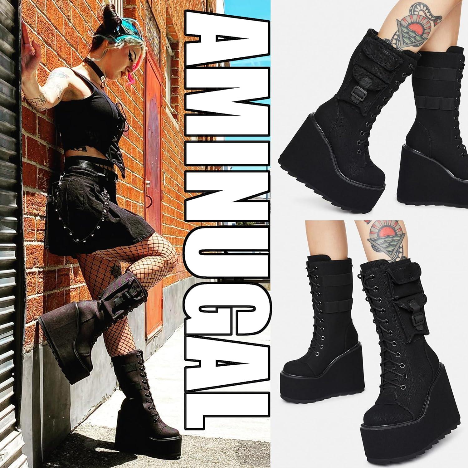 imageAMINUGAL Platform Boots for Women Wide Calf Punk Goth Black Boots Lace Up Wedge Boots for Women Round Toe Womens MidCalf Boots Moto Gothic Motorcycle Combat Boots WomensBlack