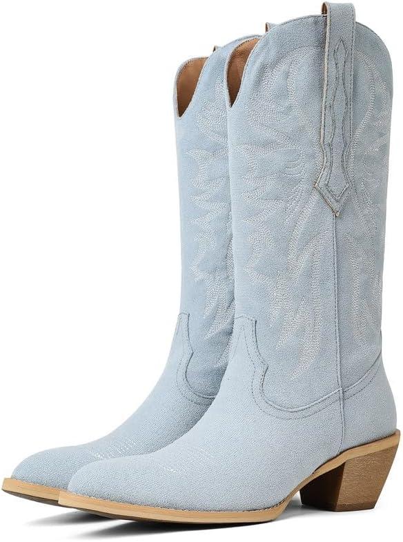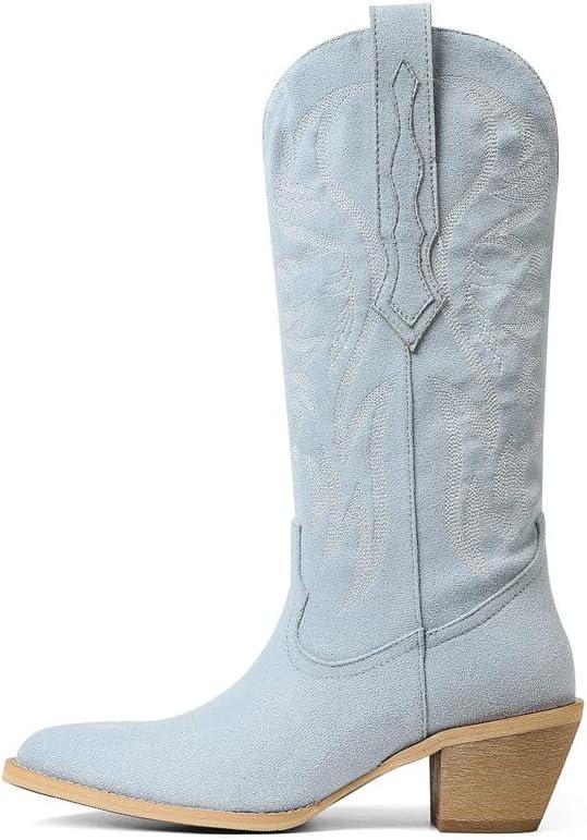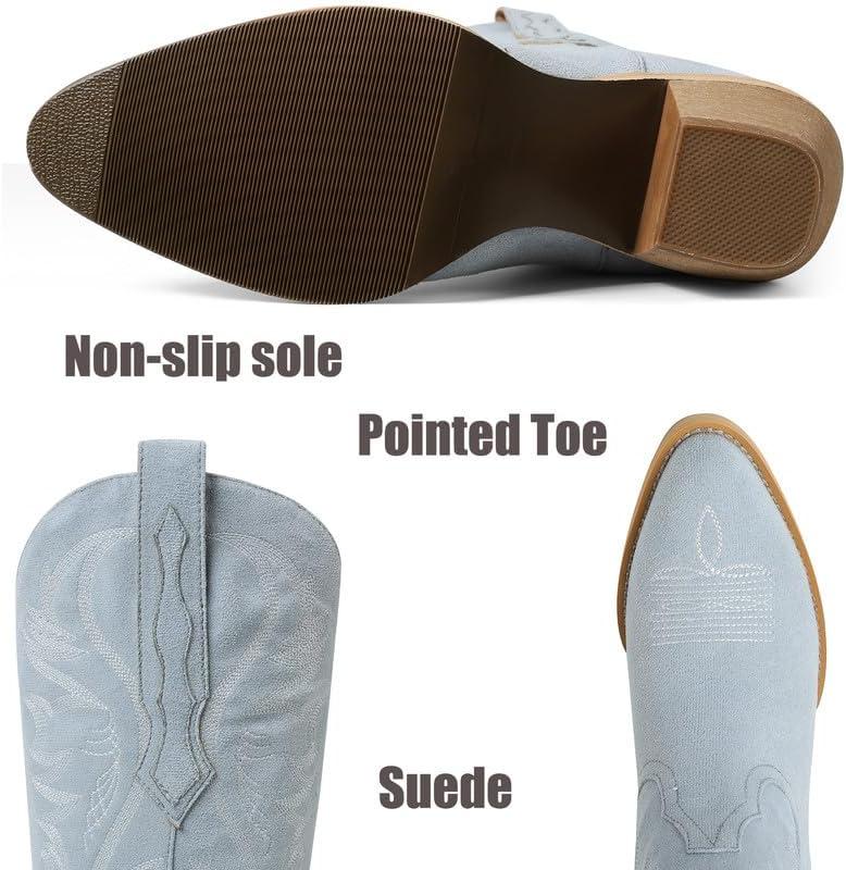 AMINUGAL Suede Cowboy Boots for Women Wide Calf Embroidered Cowgirl Pointed Toe Pull On Western Chunky Block Mid Calf Country Concert Fashion Retro Ankle Boots