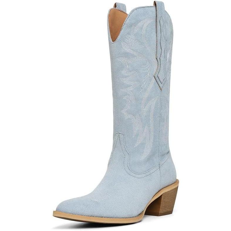 Discover the latest AMINUGAL Suede Cowboy Boots for Women Wide Calf Embroidered Cowgirl Pointed Toe Pull On Western Chunky Block Mid Calf Country Concert Fashion Retro Ankle Boots from and take advantage of our limited-time introductory offer.