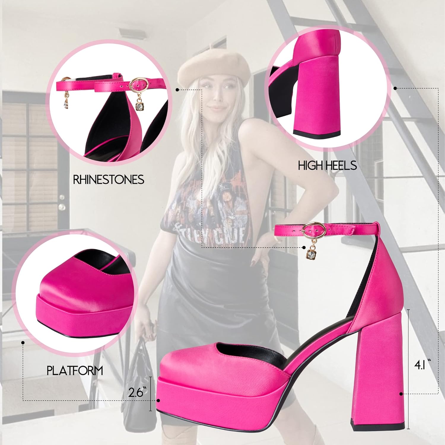 AMINUGAL Womens Platform Dress Pumps Ankle Strap Block High Heel Silk Satin Square Toe Fashion Rhinestones Heeled Pumps for Women(B-rose Red)